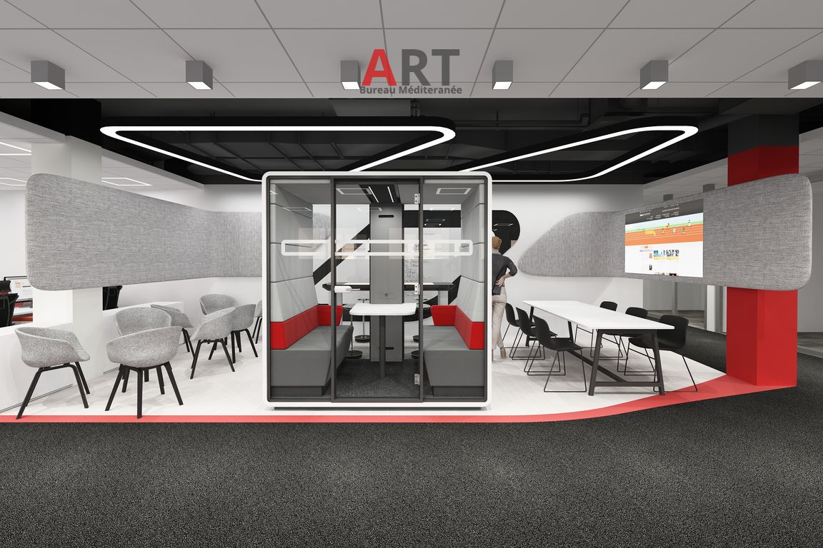 cabine acoustique fermée connectée 4 places equipée (banquettes ,table , eclairage, ventilation,prise courant ,ports USB;reseau RJ 45