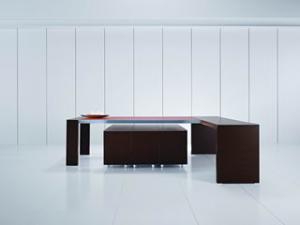 Table de bureau directionnelle avec pont rallonge latéral chêne foncé et plan en cuir Cognac / modules à tiroirs chêne foncé.